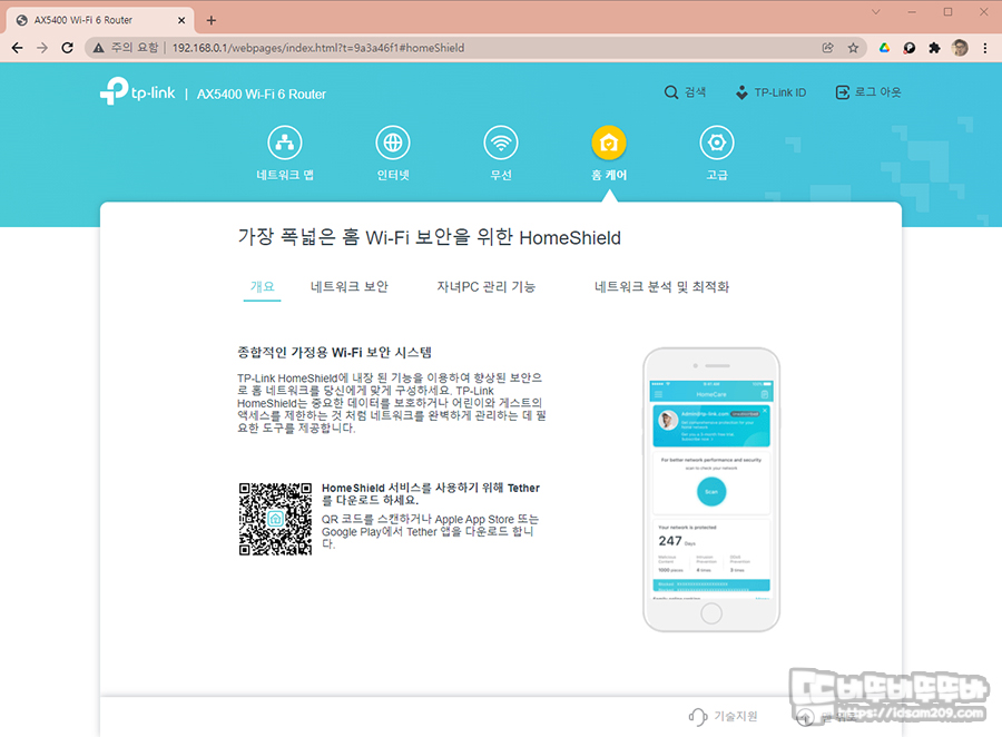 무선 메뉴는 2.4 GHz와 5 GHz 무선 설정을 간단하게 할 수 있는 메뉴로 구성되어 있으며 홈 케어 메뉴는 스마트폰 앱인 Tether을 이용하는 구조로 간편 연결을 위한 QR코드를 제공하고 있습니다.