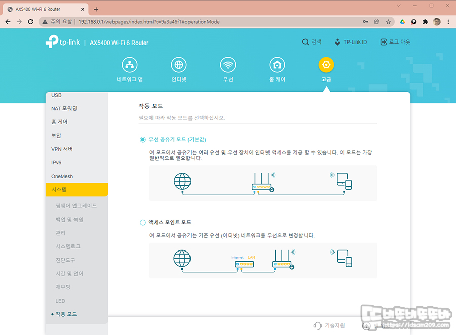공유기 사용 시 네트워크 구성에 따라 변경해야 하는 AP 모드 지원과 원 메시 기능을 지원하니 필요에 따라 사용하시면 좋을 거 같습니다.