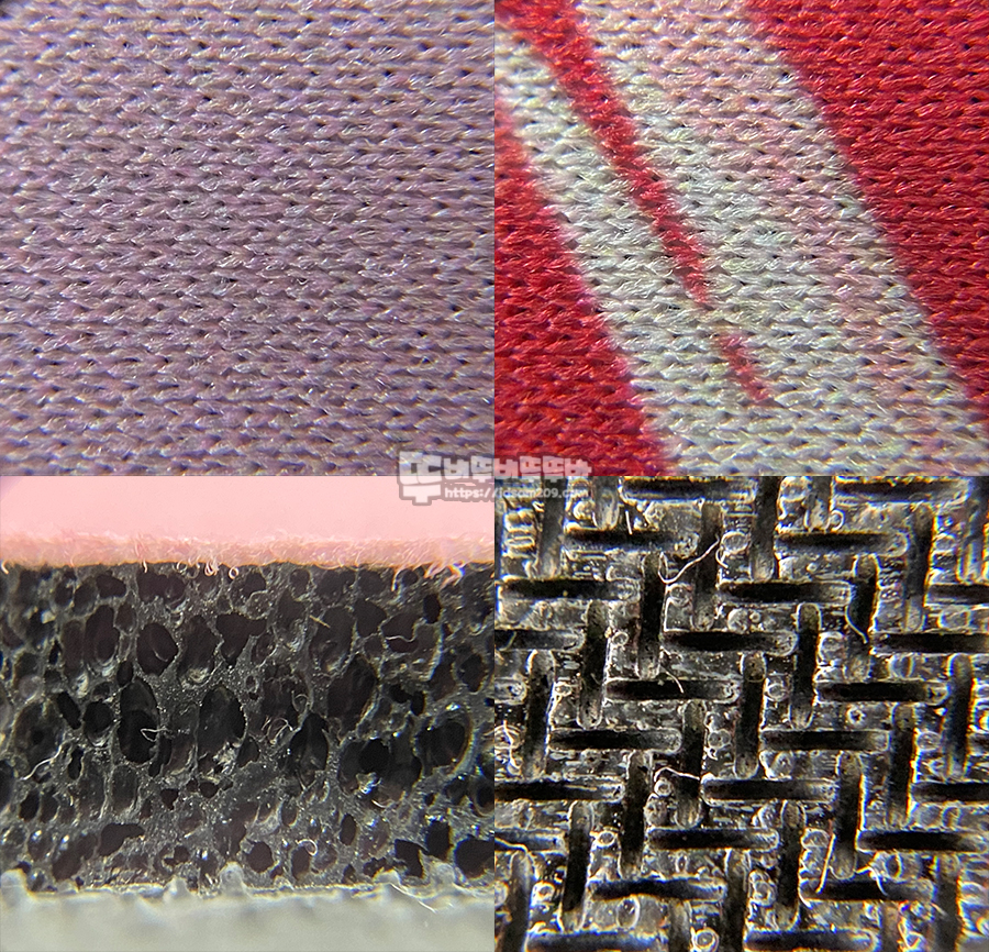 위의 핑크/레드 컬러 부분은 표면 텍스처 천은 니트 소재에서 볼 수 있을 법한 모직의 모습이지만 마우스 패드답게 촘촘하고 균일하여 마우스 피트가 전체적으로 패드에 밀착이 가능하게 디자인되어 마우스 무빙 시 슬라이딩과 브레이킹을 균등하게 해 주며 발수 코팅 처리가 되어있지는 않지만 습기와 오염에 강한 특징을 가지고 있고요.