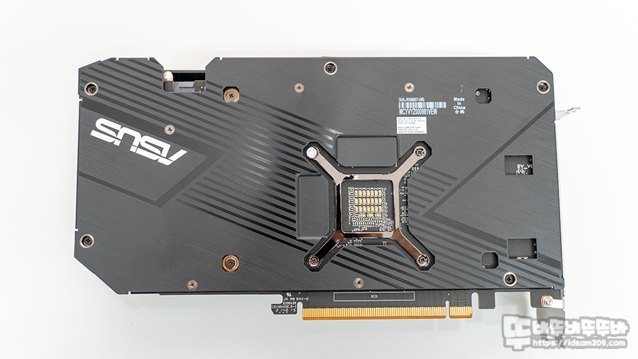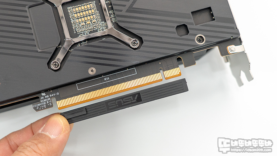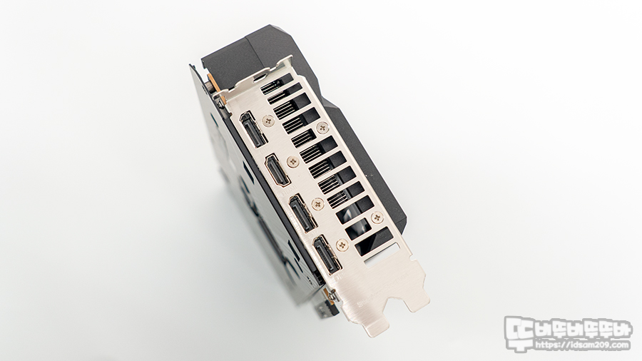 그래픽 카드 뒷면에는 휨 방지를 위한 알루미늄 백플레이트와 오픈된 구조에 GPU 브라켓을 확인할 수 있는데요.
