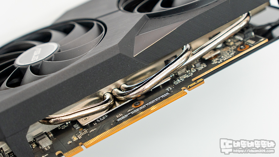 3개의 히트 파이프와 히트싱크는 그래픽카드의 메인 칩셋인 GPU와 전원부의 냉각을 담당하여 안정적인 쿨링 성능을 보여주며 기존의 그래픽카드는 PCB보다 오버스러운 히트파이프와 히트싱크 디자인과 비교하더라도 과하지 슬림한 길이로 실속형 느낌을 주고 있습니다.