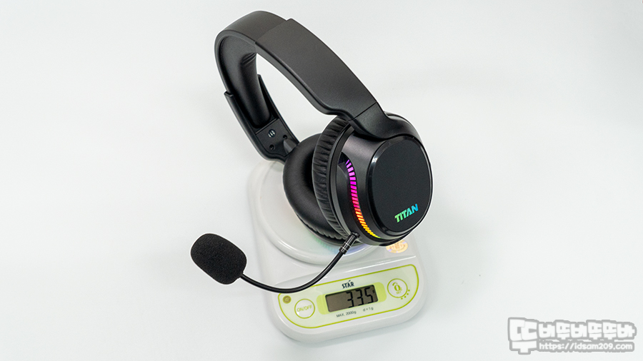제닉스 TITAN WH5 RGB 무선 게이밍 헤드셋은 마이크 장착 시 무게가 335g으로 스펙 정보 345g ± 5g 보다 가볍게 측정되는데요.