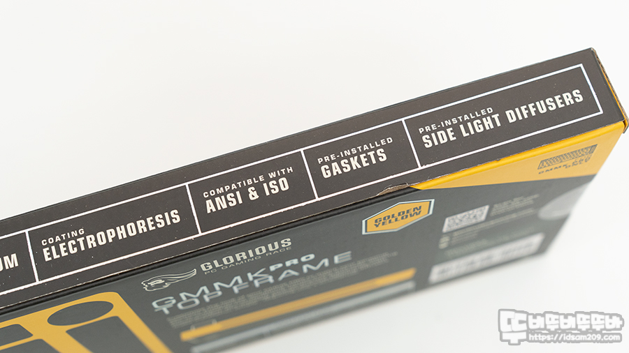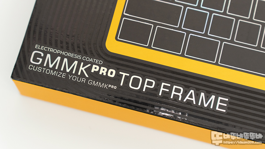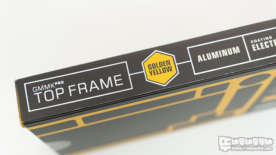 패키지에는 GMMK PRO TOP FRAMES 전기영동 코팅이 적용되었다는 카피와 제품의 컬러 Golden Yellow에 대한 정보를 부각하고 있습니다.