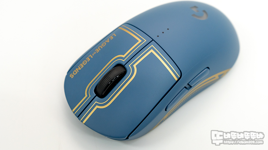 250mAh 리튬 폴리머 배터리가 사용된 로지텍 G PRO 무선 게이밍 마우스 LEAGUE OF LEGENDS 에디션은 충전 시 상단의 LED 인디케이터 3개가 순차적으로 점등하며 완충 시 LED 인디케이터가 모두 점등한 상태로 유지됩니다.