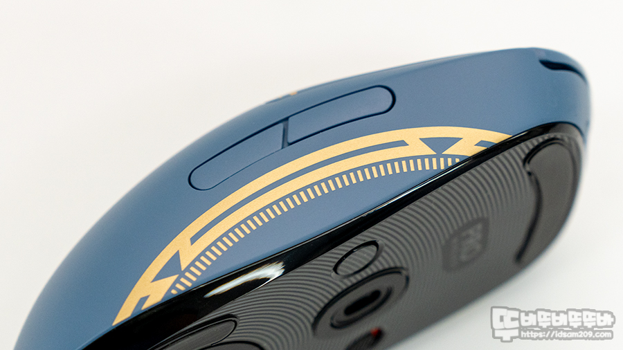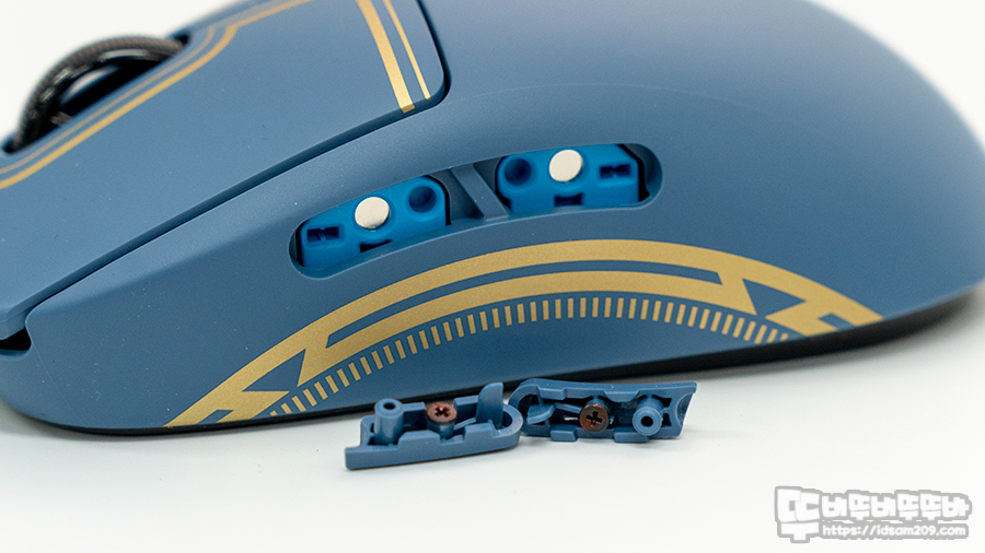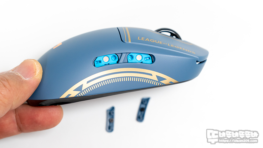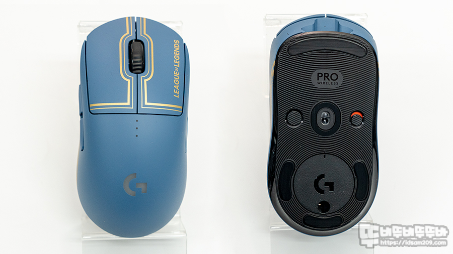 로지텍 G PRO 무선 게이밍 마우스 LEAGUE OF LEGENDS 에디션은 기본의 블랙 컬러가 아닌 블루 컬러에 휘장 느낌에 금색 라인이 인쇄되어 리미티드 에디션 모습을 느끼게 해 주며 바닥면에 DPI 버튼과 G PRO X 슈퍼라이트와는 다른 마우스 피트 모습을 확인할 수 있습니다.