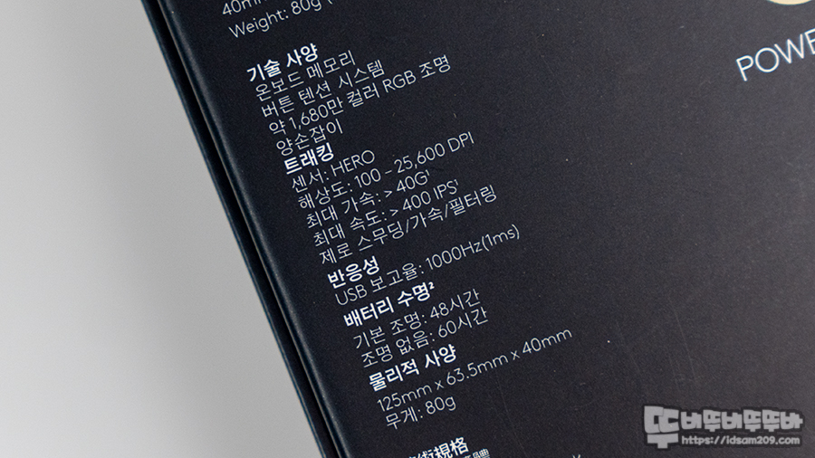 대칭형 디자인, LIGHTSPEED 무선, HERO 옵티컬(광) 25K 센서, 옴론 스위치, 폴링 레이트 : 최대 1000Hz 지원(유/무선), DPI 100~25,600, 크기 길이 125 X 너비 63.5 X 높이 40mm, 무게 80g 등의 정보와 온보드 메모리, 좌우 사이드 버튼 텐션 및 1,680만 RGB 컬러 조명 지원 등을 확인할 수 있고요.