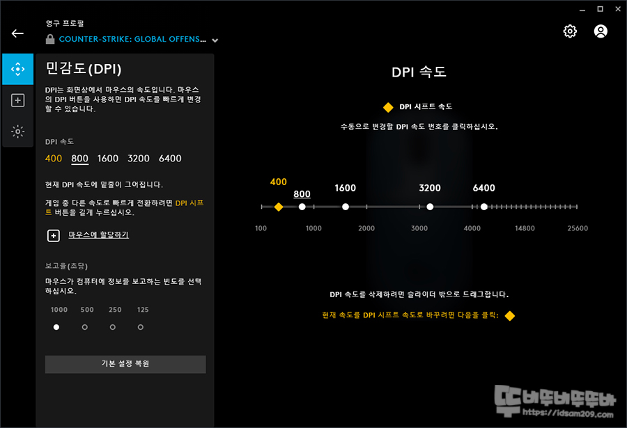 DPI 메뉴에서는 기본 5개의 DPI 값을 확인할 수 있는데 DPU 5개 이상 사용은 안 되지만 도트를 라인 아래로 드래그하여 단계를 줄일 수 있어 필요한 DPI 단계를 설정하여 사용할 수 있습니다.