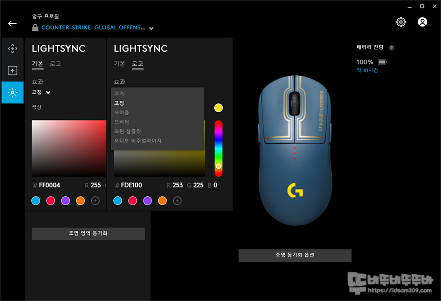 LightSync 메뉴에서는 DPI LED 인디케이터(기본)와 G 로고(로고)에 표현되는 2개의 LED ZONE을 선택할 수 있는데요.