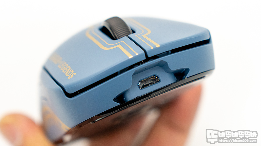 로지텍 G PRO 무선 마우스 느낌을 그대로 가지고 있지만 금색 휘장 느낌의 라인과 LEAGUE OF LEGENDS 로고가 고급스러운 느낌을 주네요.