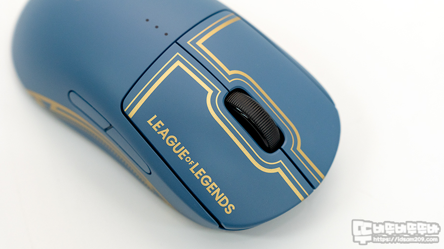 로지텍 G PRO 무선 마우스 느낌을 그대로 가지고 있지만 금색 휘장 느낌의 라인과 LEAGUE OF LEGENDS 로고가 고급스러운 느낌을 주네요.