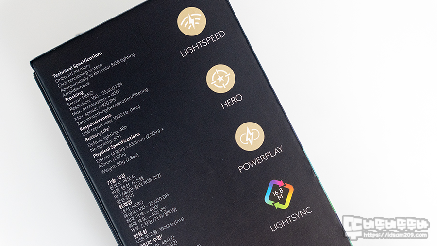 대칭형 디자인, LIGHTSPEED 무선, HERO 옵티컬(광) 25K 센서, 옴론 스위치, 폴링 레이트 : 최대 1000Hz 지원(유/무선), DPI 100~25,600, 크기 길이 125 X 너비 63.5 X 높이 40mm, 무게 80g 등의 정보와 온보드 메모리, 좌우 사이드 버튼 텐션 및 1,680만 RGB 컬러 조명 지원 등을 확인할 수 있고요.