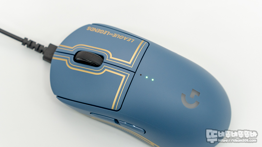 250mAh 리튬 폴리머 배터리가 사용된 로지텍 G PRO 무선 게이밍 마우스 LEAGUE OF LEGENDS 에디션은 충전 시 상단의 LED 인디케이터 3개가 순차적으로 점등하며 완충 시 LED 인디케이터가 모두 점등한 상태로 유지됩니다.