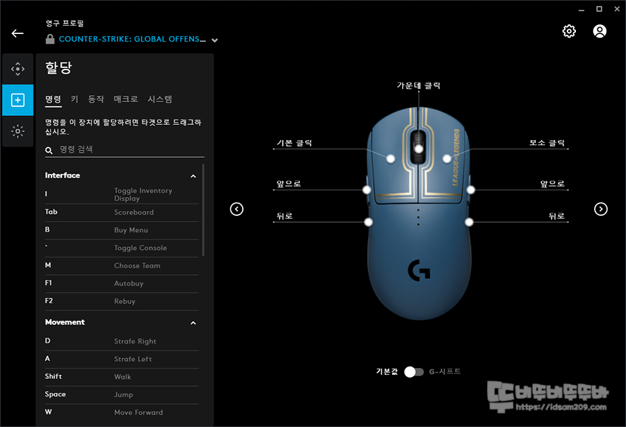 할당 메뉴에서는 버튼의 기능을 설정하는 메뉴로 기본 명령, 키보드 키, 매크로, 윈도우 시스템 명령 등을 버튼에 부여할 수 있는데요.