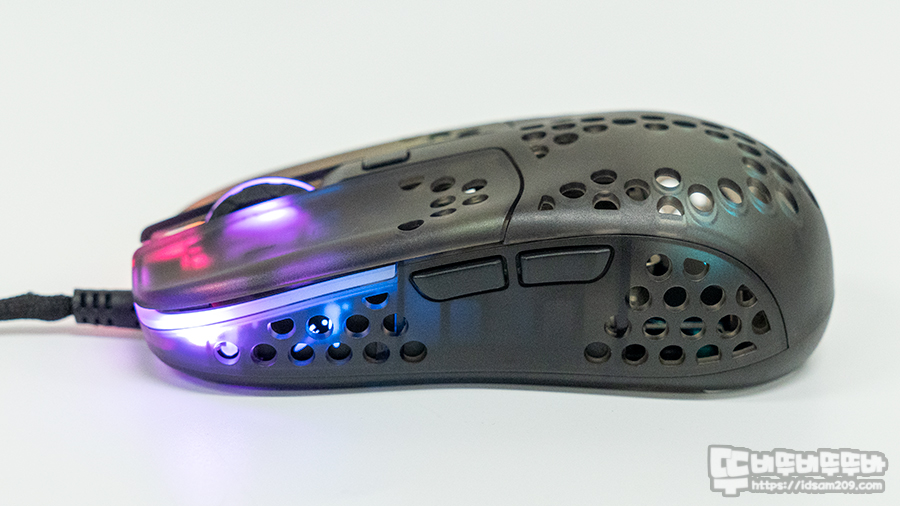 Xtrfy 엑스트리파이 MZ1 게이밍 마우스는 버튼 아랫부분에 LED 효과를 보여주는 디퓨저 라인이 적용되어 버튼 부분과 몸체 내부의 LED가 반투명 하우징을 투과하여 화려한 효과를 보여주는 게 매력이며 전면의 케이블 몰딩은 마우스를 바닥면에 놓았을 때 케이블 쓸림이 없게 살짝 위로 향하는 디자인으로 유선 마우스로 게임을 즐기는 분들의 케이블 쓸림 고충을 잘 반영한 거 같습니다.