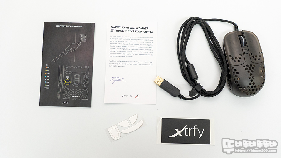 제품은 브로슈어 형태의 사용 설명서, 감사 카드, 여분의 PTFE 피트, Xtrfy 스티커 마우스 본체로 구성되어 있고요.