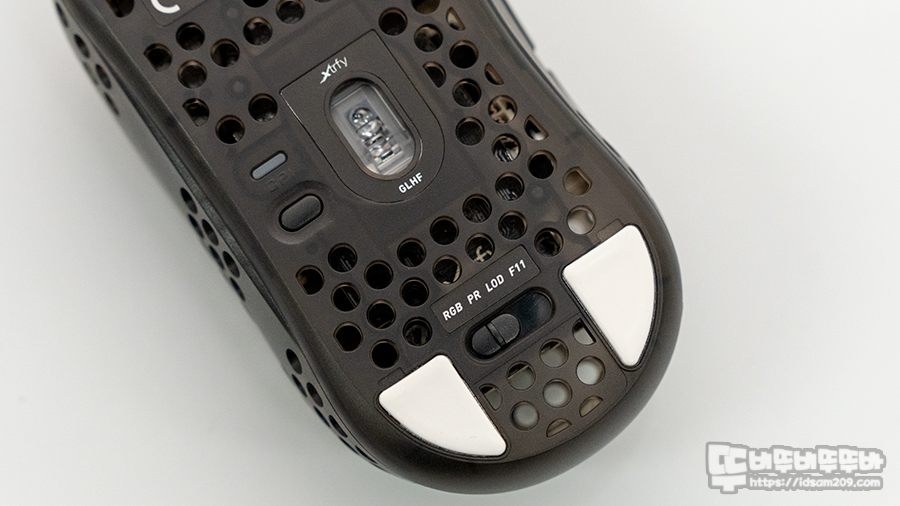 센서 옆부분에 CPI 변경, 뒤쪽의 4단계 셀렉트 스위치로 RGB LED 효과 / PR(폴링레이트) / LOD 높이 조절 / F11 기능 설정을 지원하며 관련 내용은 "제품 특징" 섹션에서 자세히 다루겠습니다.