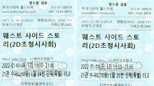 장소 : 롯데시네마 월드타워 21관 (수퍼G) L열 24, 25번