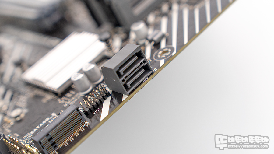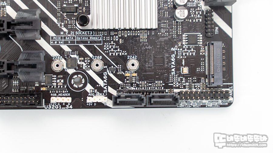 24핀 커넥터 아래쪽에는 SATA 6Gb/s 커넥터 3,4번과 TPM 포트, 그리고 메인보드 아래쪽에 위치한 전면 I/O 포트 옆에 SATA 6 Gb/s 포트 1, 2번이 위하고 있고요.