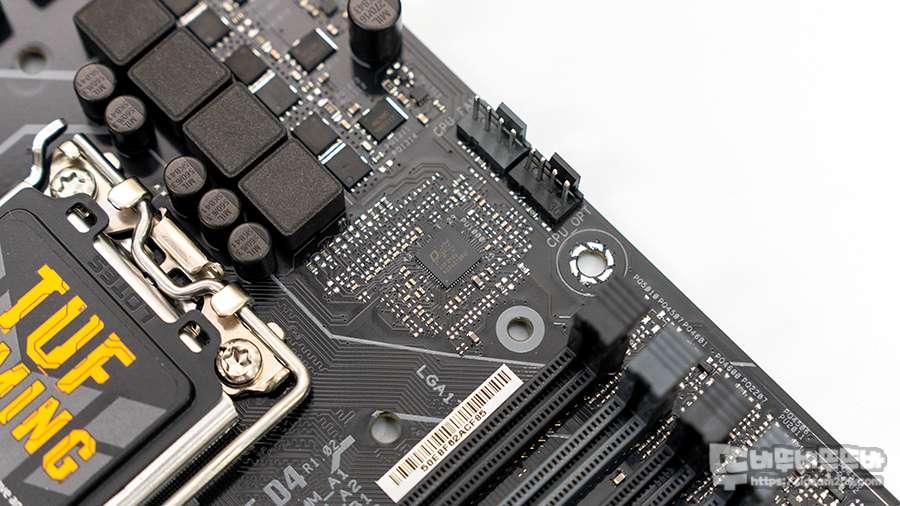 블랙 PCB에 옐로우 컬러로 TUF 글씨와 메인보드 전원 커넥터 옆에 TUF LED 라이팅 존으로 제품의 아이덴티티를 표현하고 있습니다.