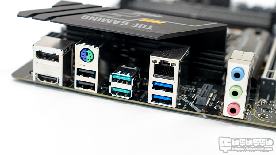 10페이즈 전원부로 구성된 ASUS TUF Gaming B660M-E D4 메인보드는 일부지만 TUF GAMMING 글씨가 각인된 검정색 히트싱크를 제공하며 I/O 포트 부분을 커버해 주고 있습니다.