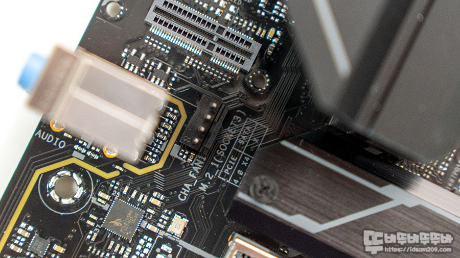 특히 오디오 단자 옆에는 저장용으로 사용하는 M.2 M키 슬롯이 아닌 와이파이용으로 사용된 E키 슬롯을 기본으로 제공하고 있어 필요에 따라 와이파이/블루투스 모듈을 구입하여 메인보드 내장 무선 인터넷 구축이 가능하고요.