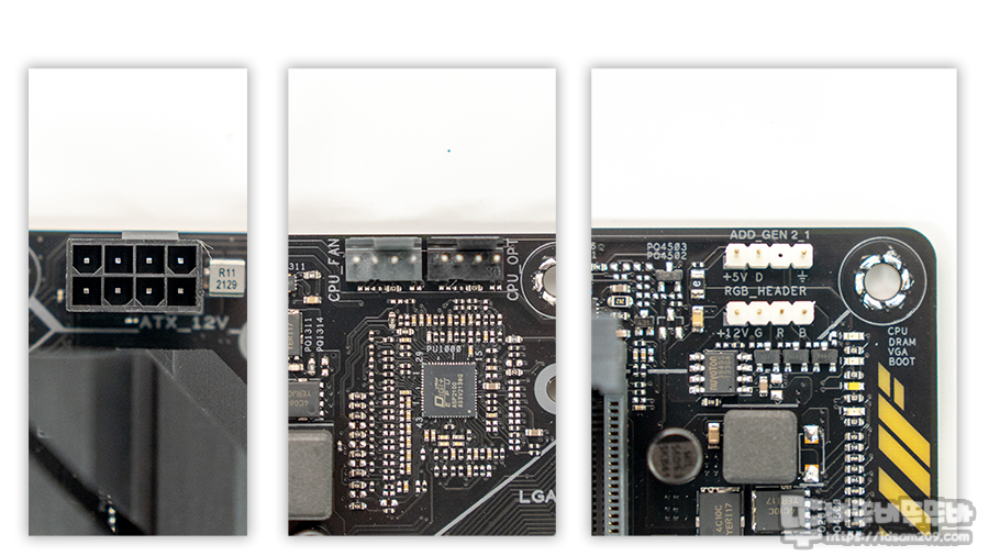 상단에 위치한 메인보드 보조 전원 8핀, CPU 팬과 CPU OPT 커넥터, 그리고 +12V RGB 헤더와 +5V Addressable GEN2 헤더 그리고 부팅 상태를 알려주는 Q-LED가 내장되어 CPU/DRAM/VGA/BOOT 등 시스템 부팅 시 문제가 되는 요소를 LED 상태로 빠르게 확인할 수 있습니다.