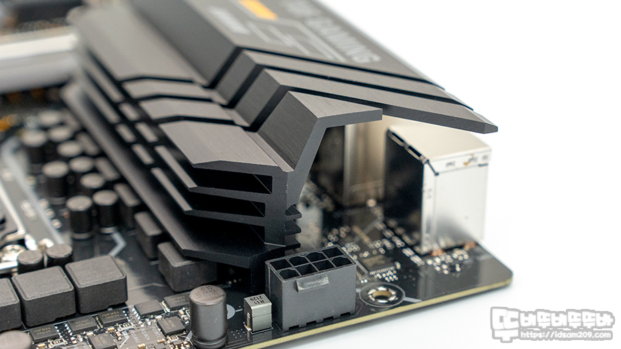 10페이즈 전원부로 구성된 ASUS TUF Gaming B660M-E D4 메인보드는 일부지만 TUF GAMMING 글씨가 각인된 검정색 히트싱크를 제공하며 I/O 포트 부분을 커버해 주고 있습니다.