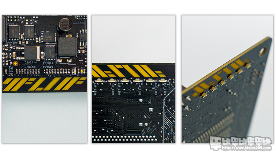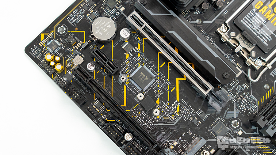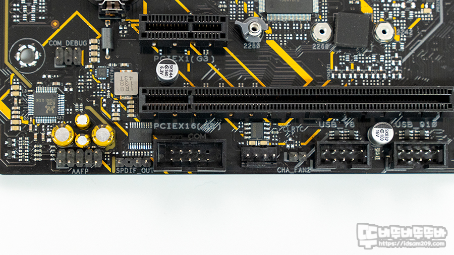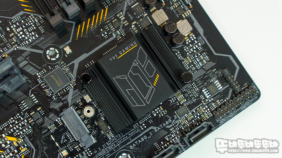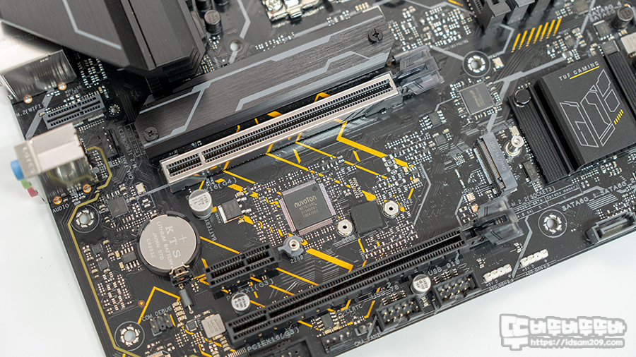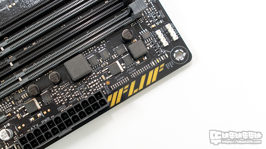 블랙 PCB에 옐로우 컬러로 TUF 글씨와 메인보드 전원 커넥터 옆에 TUF LED 라이팅 존으로 제품의 아이덴티티를 표현하고 있습니다.
