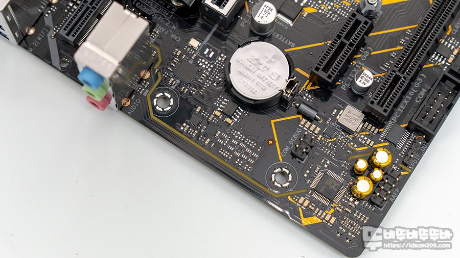 특히 오디오 단자 옆에는 저장용으로 사용하는 M.2 M키 슬롯이 아닌 와이파이용으로 사용된 E키 슬롯을 기본으로 제공하고 있어 필요에 따라 와이파이/블루투스 모듈을 구입하여 메인보드 내장 무선 인터넷 구축이 가능하고요.