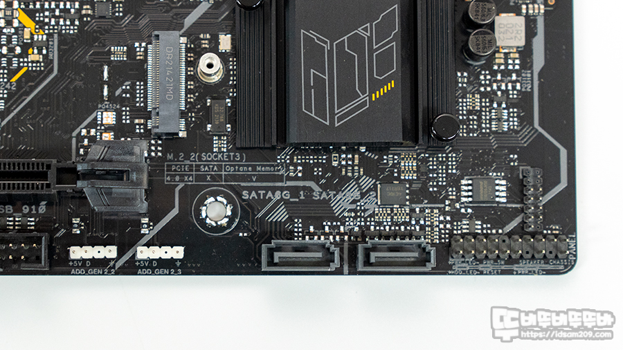 보드 아랫부분에 전면 I/O포트 연결 핀, SATA 6G 1번과 2번 소켓, +12V RGB 헤더와 +5V Addressable GEN2 헤더 그리고 USB 2.0 헤더와 CHA FAN 2 커넥터, AAFP 전면 오디오 핀으로 구성되어 있습니다.