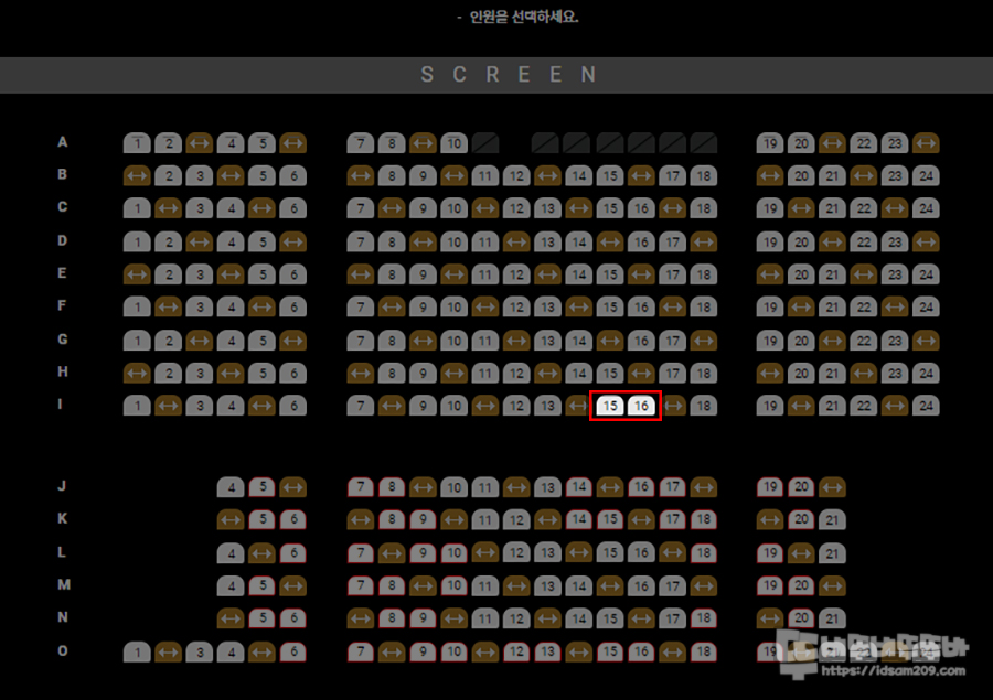 i열 15, 16번에서 관람 시 눈에 보이는 스크린 사이즈도 괜찮은 편인데요. 스크린을 약간 올려다보는 느낌이 있어 다음에 관람 시에는 J열을 선택해야 할 거 같네요.