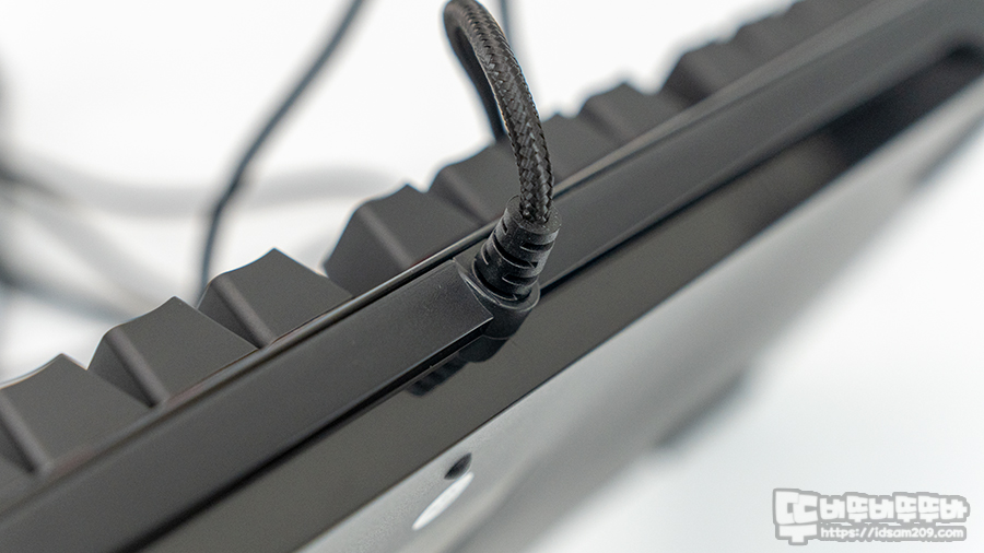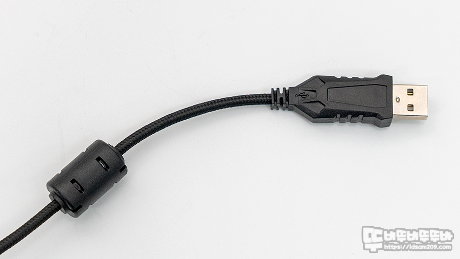 패브릭 소재가 사용된 케이블은 가운데 위치하고 있으며 꺾임을 방지하는 몰딩이 사용되었으며 케이블 끝부분에는 전자파 유입을 방지하는 페라이트 코어와 USB 단자를 확인할 수 있습니다.