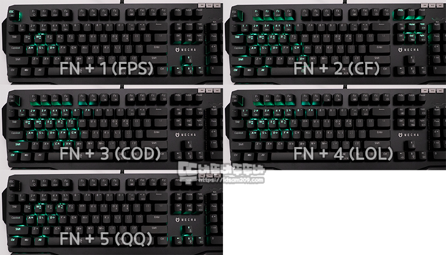 F5~ F8 = 미디어 제어, F9 = 15가지 LED 효과, F10~F12 = 볼륨 제어, 1(CM1)/ 2(CM2)/ 3(CM3)/ 4(CM4)/ 5(CM5) = LED 매크로 저장 키