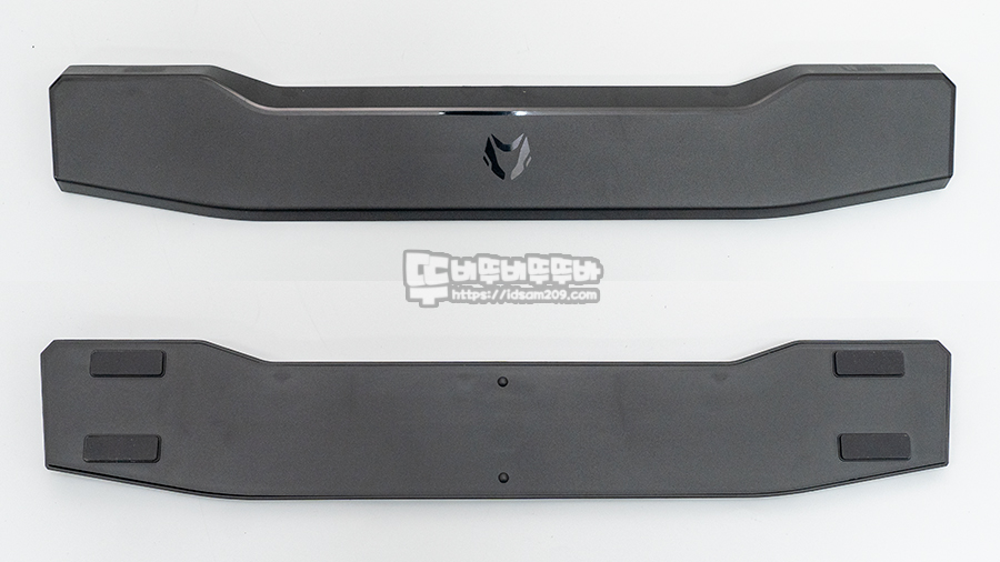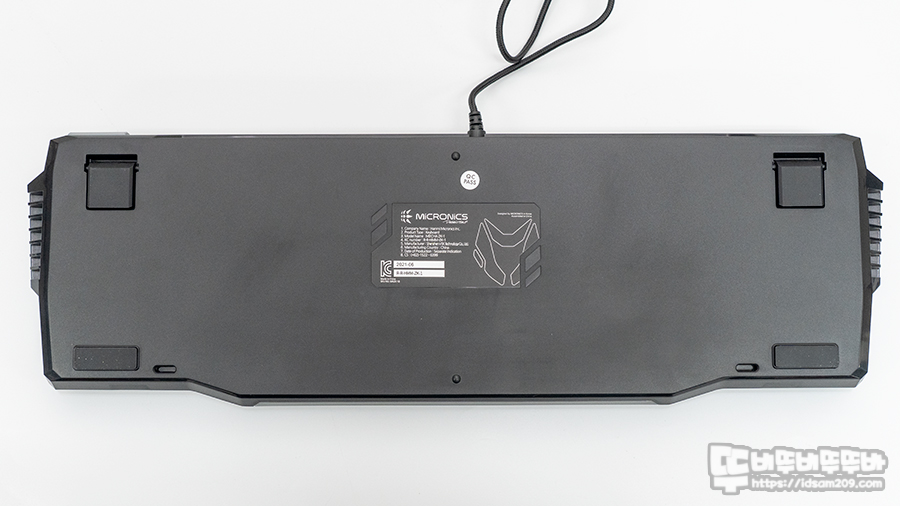 보통 목재나 아스텔 또는 사출 제작 시 내부 휨을 방지하는 구조로 제작되는 팜레스트는 강도가 있어 양쪽 끝부분에만 미끄럼 방지 패드를 사용해도 휘는 현상 없이 버티긴 하지만, 플라스틱 사출을 위/아래로 결합하는 방식으로 디자인된 마이크로닉스 MECHA ZK-1의 팜레스트는 속이 텅 빈 상황이라 휘어짐에 대한 보강이 필요한데 외형 디자인에 신경 쓴 나머지 팜레스트 기능에 대해서는 연구를 하지 못한 느낌이 들었습니다.
