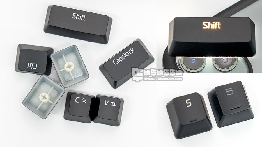 사진 우측 하단의 비교 사진을 보시면 마닉의 키캡(왼쪽)과 일반 ABS코팅 키캡 (오른쪽)의 각인 차이를 보면 각인 상태가 고급진 느낌을 주지만, 오랜 사용 시 코팅이 벗겨지는 부분은 피할 수 없으니 참고하시기 바랍니다.