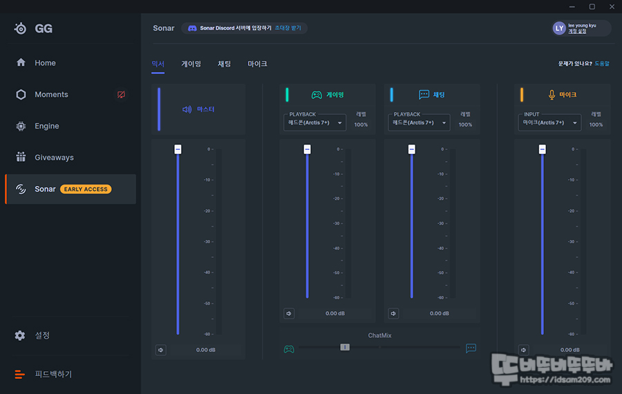 Sonar 메뉴는 볼륨 믹서 / 게이밍 / 채팅 / 마이크 설정 메뉴로 세분화되어있는데요.