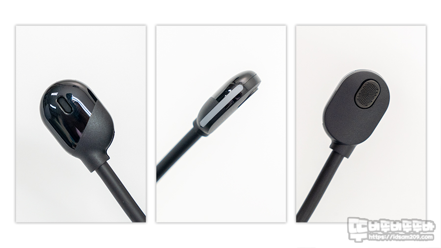 이어컵 하우징에 넣고, 뽑아서 사용하는 수납형 마이크는 약 11cm 길이로 노이즈 캔슬링 마이크를 사용하여 마이크 시 주변이 노이즈를 많이 줄여주는 형태로 수음이 되며 마이크 끝부분에 마이크 Off 시 표현되는 LED 인디케이터가 내장되어 직관적인 마이크 상태를 확인할 수 있습니다.
