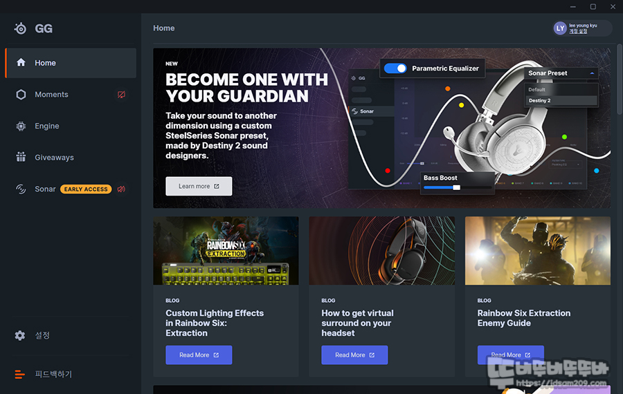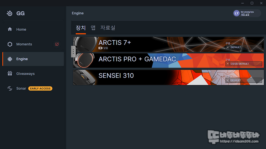 SteelSeries Engine에서 통합 솔루션 GG로 업그레이드 된 소프트웨어는 AMD나 nVIDIA 드라이버에서 방송 송출, 영상/사진 캡처, 공유 등의 기능을 담당하는 모멘트 기능은 넘어가고 각 연결 장치의 설정을 담당하는 Engine 메뉴 그리고 Arctis 7+부터 사용할 수 있는 Sonar 기능을 중점으로 살펴보겠습니다.