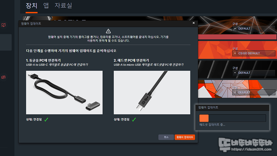 이때 무선 리시버를 본체에 연결한 상태에서 헤드셋은 USB-C to A 충전 케이블로 헤드셋을 동시에 연결하여 펌웨어를 진행 후 PC에 연결된 USB 케이블은 분리하시면 됩니다.