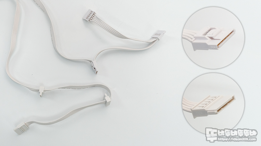 케이블 한쪽에 구성된 SATA 커넥터는 고정력이 좋은 락킹 기능이 있는 커넥터가 사용되었으며 나머지 케이블에는 락킹 기능이 없는 커넥터가 사용되었으니 연결하는 장치에 따라 구분하여 사용하시면 좋을 거 같습니다.