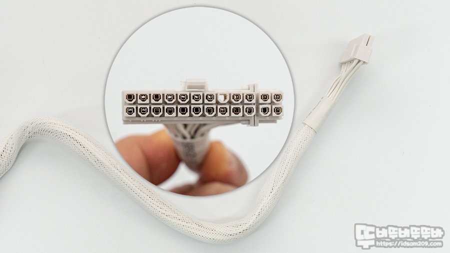 플랫 케이블을 사용하고 있지만 케이블 가닥수가 많은 메인 전원 케이블만 슬리빙 처리가 되어있으며 전체 길이 550mm로 24핀(20+4) 커넥터 1개로 구성을 확인할 수 있고요.