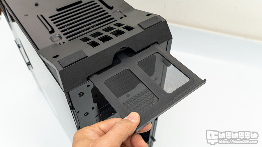 케이스를 안정적으로 받혀주는 다리 부분에는 미끄럼 방지 패드가 부착되어 있으며 파워서플라이 부분의 먼지 필터는 샤시 뒤쪽에서 슬라이딩 방식으로 탈부착이 가능하여 간편한 유지보수를 지원합니다.