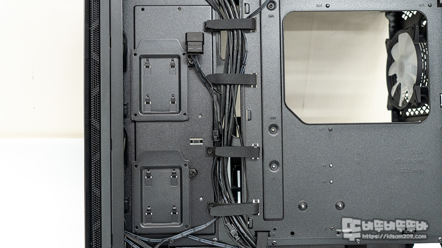 메인보드가 조립되는 샤시면에는 마름모 형태의 케이블 정리 홀을 제공하여 샤시 뒤쪽에서 다양한 케이블을 깔끔하게 정리할 수 있게 도와주고요.