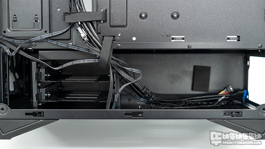 239mm의 파워서플라이 장착 공간 앞쪽에는 HDD/SSD 겸용으로 사용할 수 있는 하드 가이드를 제공하여 SSD 4개 또는 SSD 3개/HDD 1개, SSD 2개/HDD 2개로 저장 장치 구성이 가능합니다.