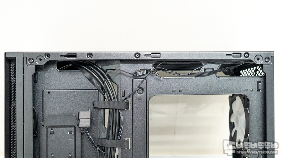 케이스 상단에 여유가 있어 메인보드를 조립한 후에 CPU 보조전원 케이블을 넘길 수 있으며 샤시 중앙부에는 벨크로 타이가 기본으로 제공하고 있어 케이블 정리를 깔끔하게 할 수 있게 도움을 줍니다.