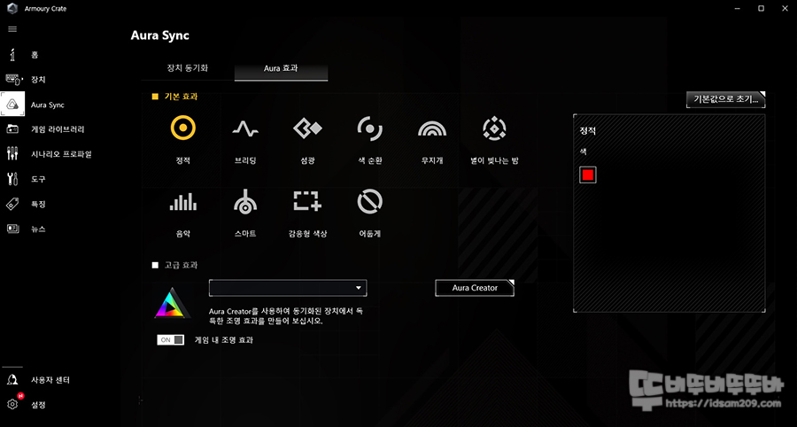 RGB LED 효과를 위해서 ASUS 메인보드의 AURA Sync 프로그램을 이용하여 LED 효과를 살펴보았습니다.