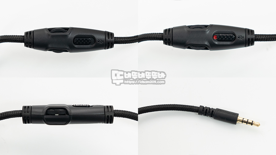 인라인 컨트롤러는 볼륨 조절 다이얼과 마이크 On/Off 스위치로 구성되어 있으며 마이크 Off 시 스위치 바닥면에 레드 도트가 노출되는 디자인으로 직관적인 사용이 가능하며 기본 4극 3.5mm 스테레오 단자를 모습을 확인할 수 있습니다.