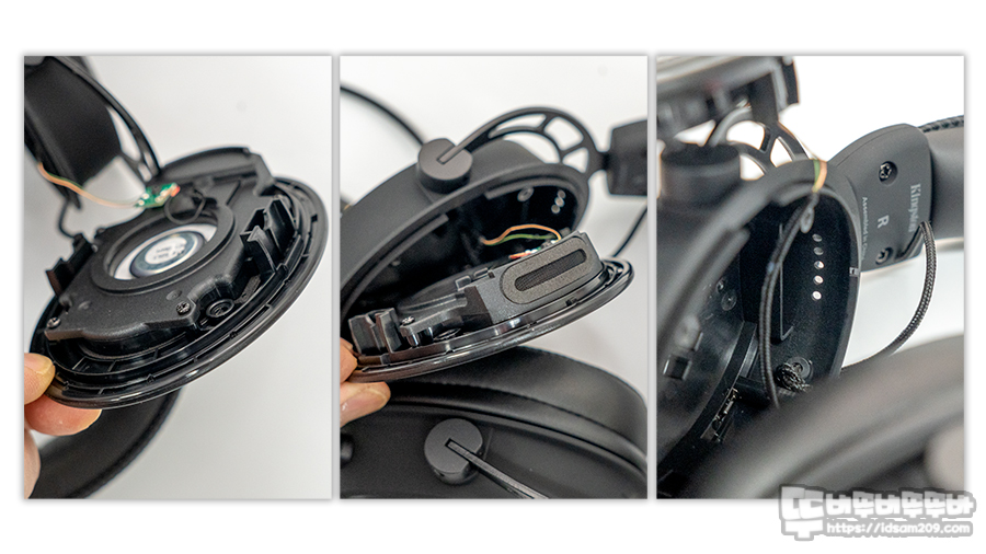 커버 형태의 이어패드를 벗겨보면 스피커가 부착된 플레이트에는 금속 보호 커버로 디자인된 50mm 드라이버 유닛과 유닛 위/아래로 공기 흐름을 위해 부착된 부직포 모습이 눈에 띕니다.