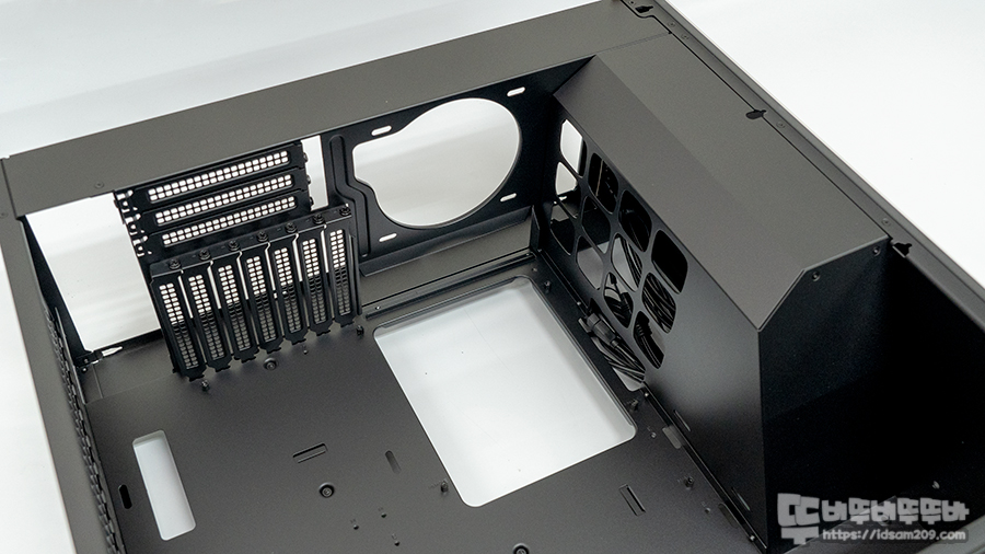 새시 내부에서 상단 쪽으로 살펴보면 7개의 PCI 슬롯 그리고 라이저 카드를 이용 시 사용 가능한 버티컬 슬롯 3개 그리고 120mm 쿨러와 수냉 쿨러 사용 시 워터 블록이 넘어올 수 있게 디자인된 모습을 확인할 수 있으며, 오른쪽 측면에는 220mm 사이즈 ATX 규격의 파워서플라이 장착이 가능한 공간을 따로 제공하고 있습니다.
