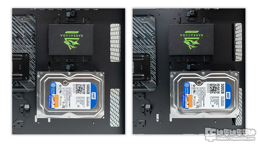 HDD/SSD 겸용으로 디자인되었지만 HDD의 경우 양옆으로 위치 이동이 가능하기에 샤시에 장착 시 전원 및 SATA 케이블 위치에 따라 선택하시면 좋을 거 같습니다.